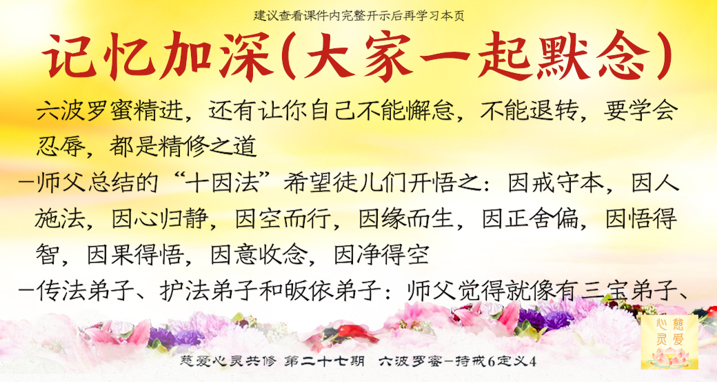 要记住,悟道就是要改变你的过去,如果没有落实到行动当中,就会在迷茫中造业,在迷迷糊糊中讲错话,做错事情,在不平等的心中,行为中犯罪等等,你就一定会在六道中轮回,而脱离不了苦海,所以要因戒守本,因人施法,因心归静,因空而行,因缘而生,因正舍偏,因悟得智,因果得悟,因意收念,因净得空——这是师父总结的“十因法”,希望徒儿们开悟之。